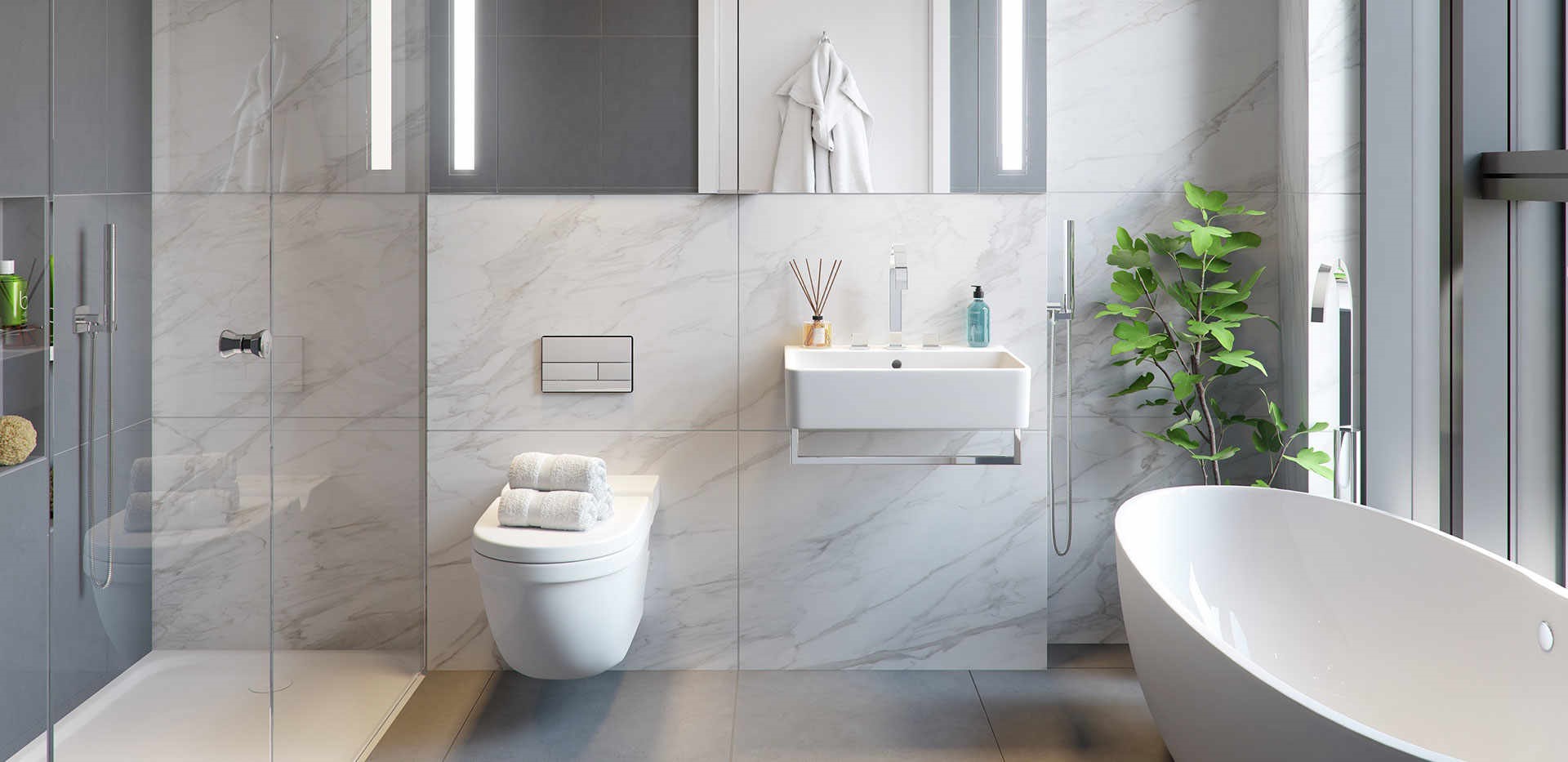 - Белая керамическая плитка с прожилками серого цвета