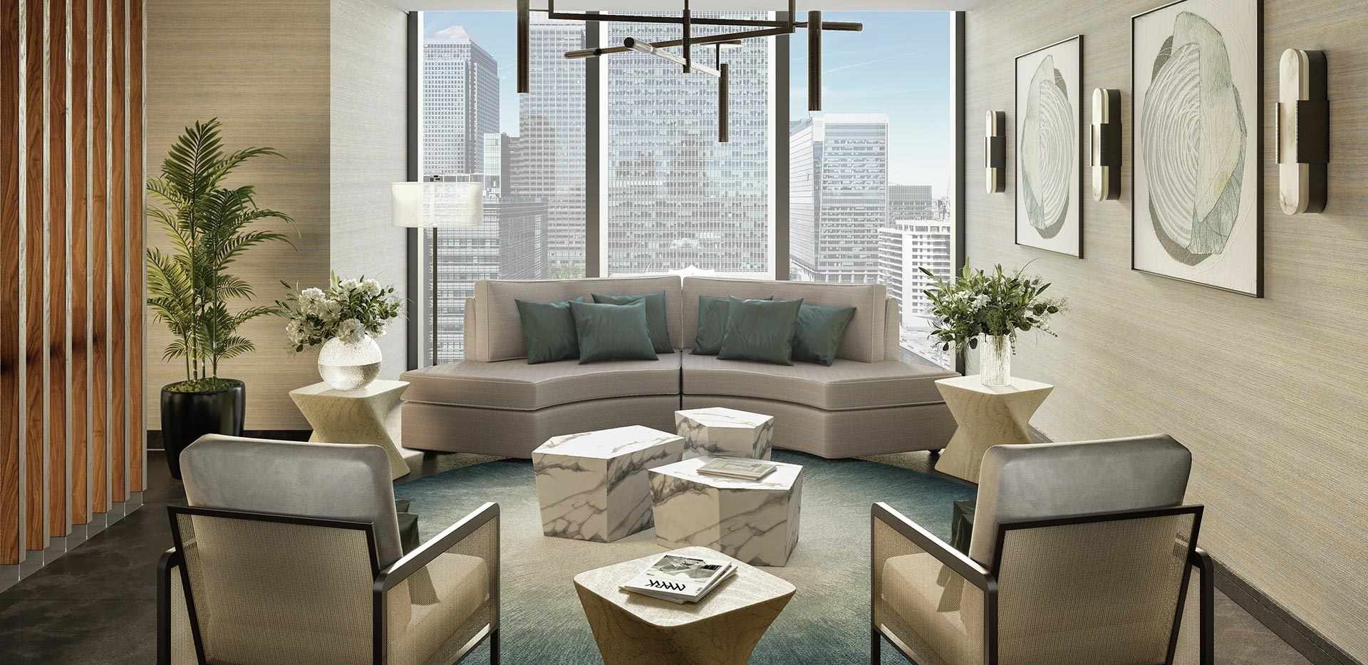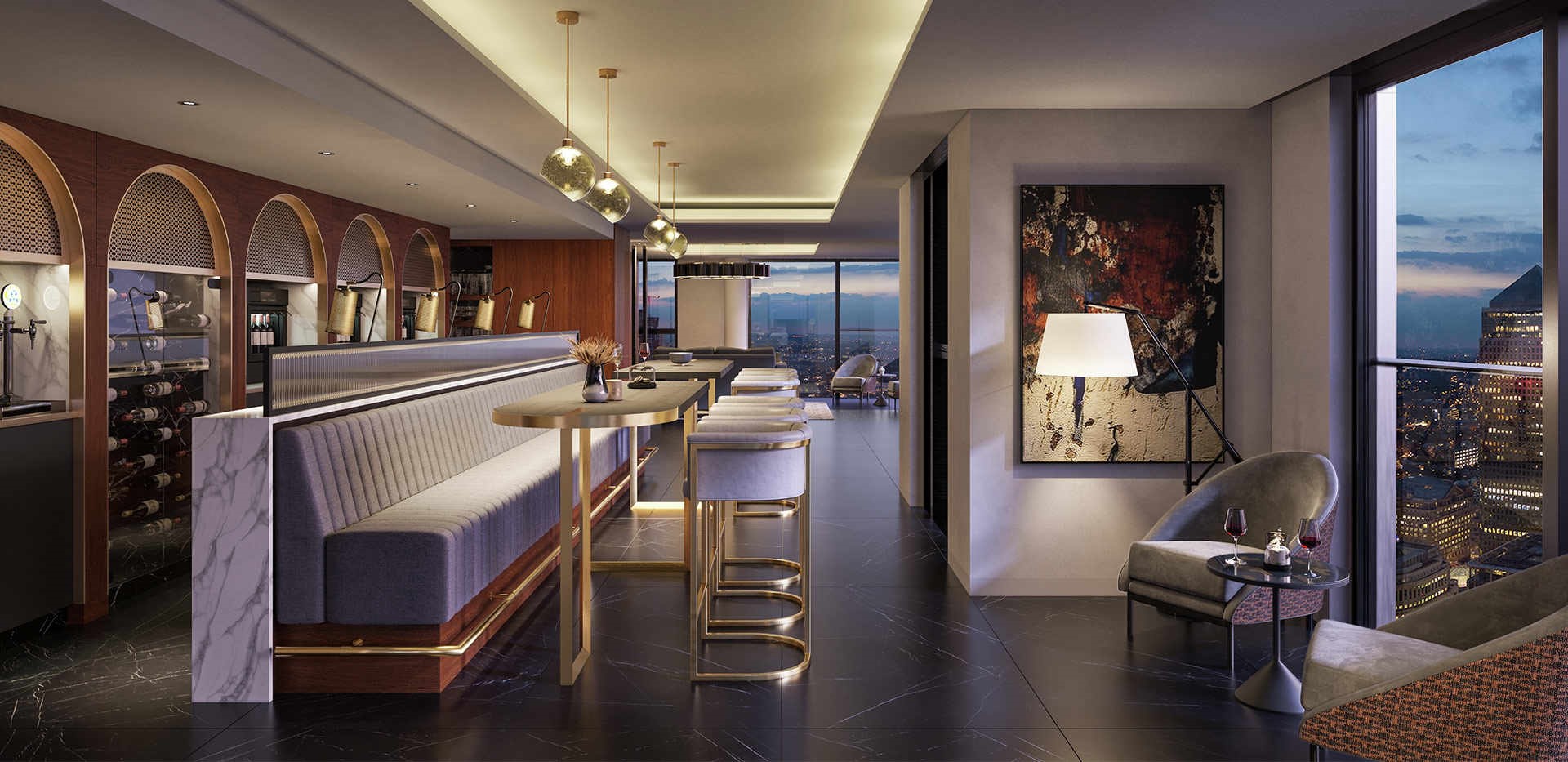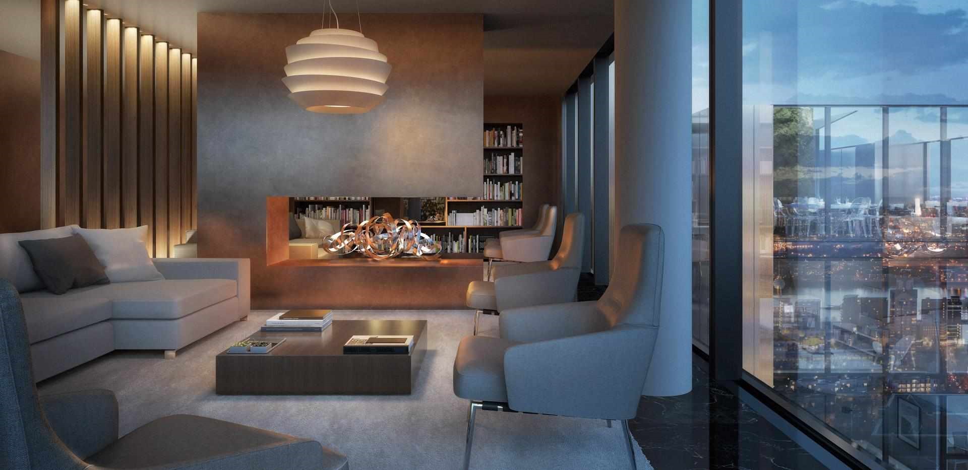 Жители смогут насладиться красивым баром, спроектированным Foster + Partners, уютными гостиными уголками, кинозалом, телевизионной стеной, библиотекой, залом заседаний, конференц-залом, из которых также открывается панорамный вид на Canary Wharf, Темзу, город и другие районы.