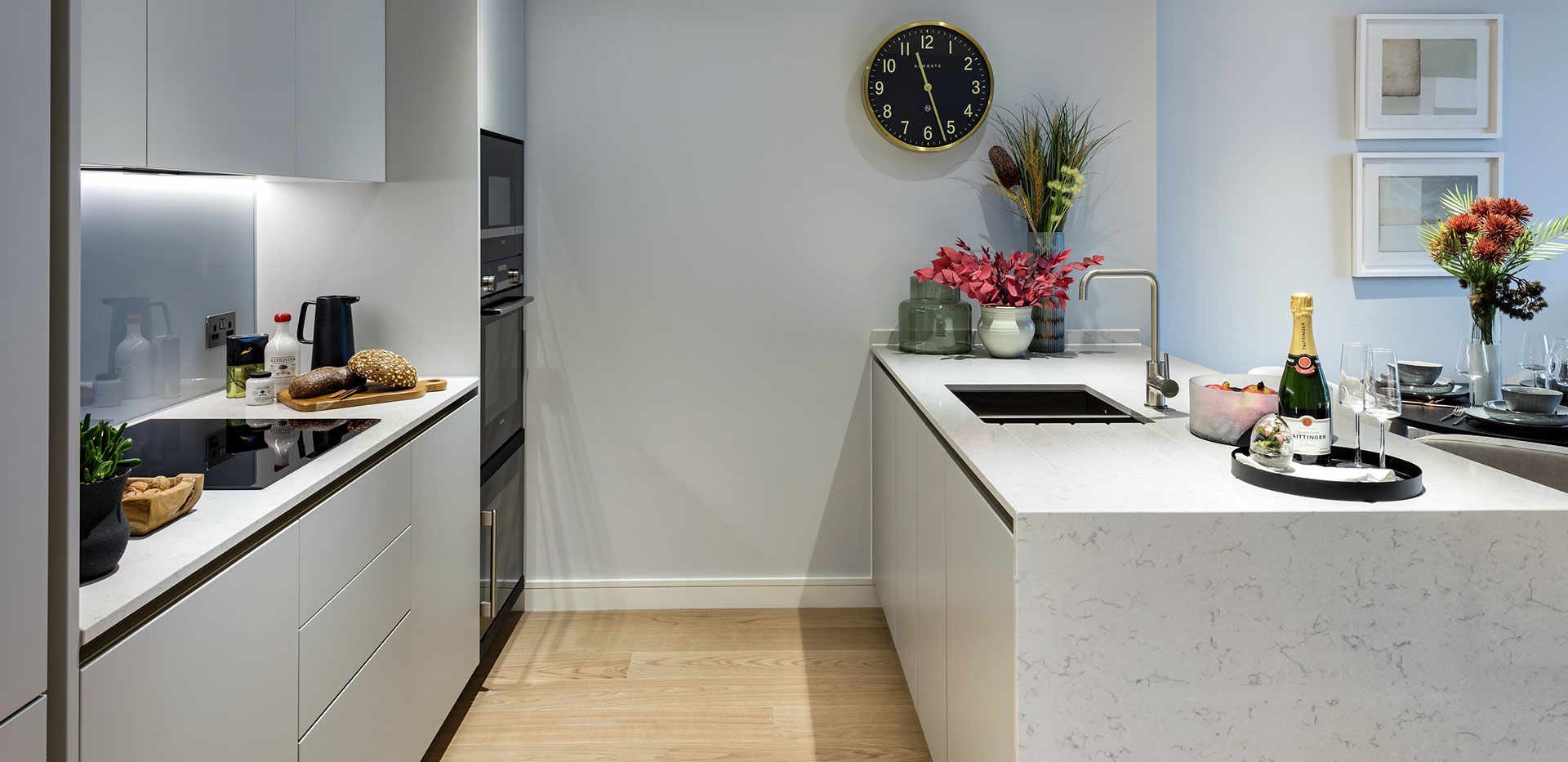 - Все столешницы и стойки изготовлены из искусственного камня со стеклянным фартуком.