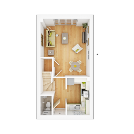 Дом на первом этаже имеет прихожую, которая ведет в кухню / столовую и светлую и просторную гостиную с французскими дверями в частный сад. Также внизу есть гостевая гардеробная и кладовая.